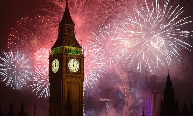 آتش‌بازی سال نو میلادی در آسمان شب لندن در کنار برج بیگ‌بن